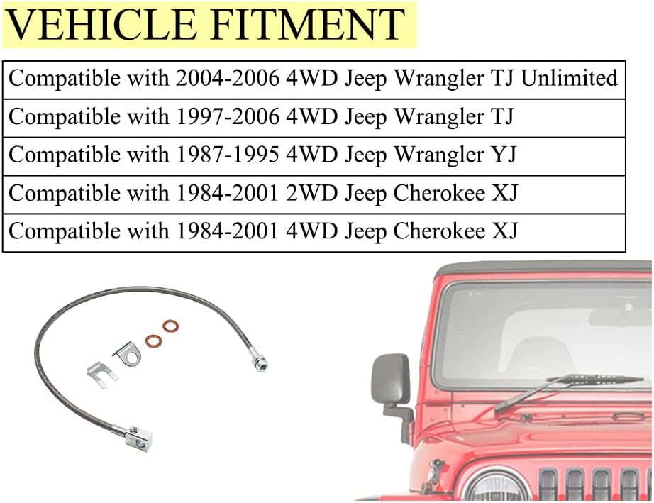 • Product description: 89703 Stainless Brake Line 4-6'' suspension Lift 25'' fits for 1984-2001 Jeep Cherokee XJ, 1987-2006 Jeep Wrangler TJ LJ YJ